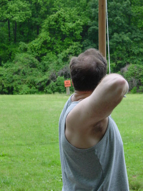 For a long time I doubted people drawing 150 lb bows. Then I came across some pictures showing the Medieval method of pulling the bow. The common method of shooting a bow these days is the Victorian method. This is where you pull the bowstring back with the small, Rear Deltoid Muscle to the chin or eye and aim down the arrow-shaft. The main focus is accuracy. To pull a heavy bow you have to learn to shoot with the Medieval method. This method involves leaning forward in pulling the bowstring back with the larger Latissimus Dorsi Muscle while squatting down a bit for balance. As you straighten up your hand will naturally land by your ear-lobe. These are the same muscles you use to do a chin-up. So effectively you are doing a one handed chin-up into the bow.