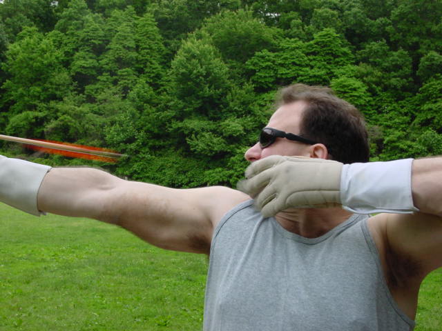 I have prepared two small 350 k videos showing the Medieval Method of loosing a bow. Note that in the other pictures on this webpage I am loosing in the Victorian Method.