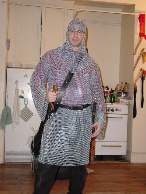 I bought a suit of mail armor for the purpose of experiencing what it is like to fight in it. The suit weighs a total of 40 lbs including the head piece. The rings are stainless steal and butted. Mail was traditionally worn with a gambeson (padded suit) underneath, particularly in the late medieval period. I have not been able to get an accurate date regarding when the padding became standard with mail. Some references state that mail was in use from the 5 nth century B.C. and it has been suggested that padding was not standard until the 12 th century A.D. For now I will use the mail without padding until I decide to get some.