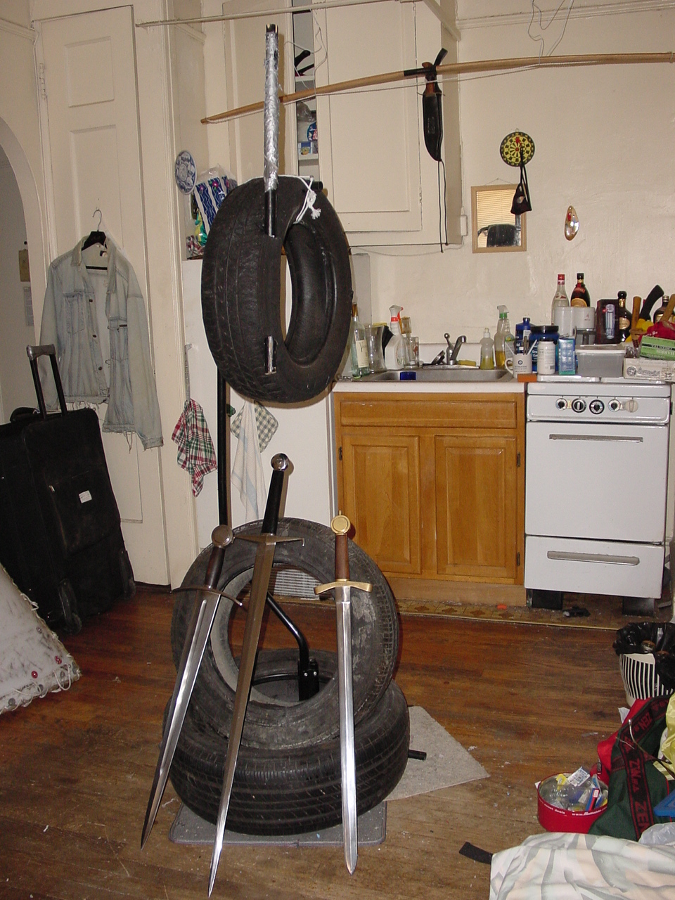 The swords reviewed here have been tested by striking them against the tire-pell you see pictured at least 2000 times. Most strikes were done with full force. No mercy was given to the blades nor the tire-pell. The strikes were from every direction and included strikes with the false edge (short edge) and the flat too. Many thrust were also executed particularly on blades intended for thrusting. The Valiant Armory War Sword failed in 20 blows. The manufacturer gave me what I think is a very lame excuse about intended use. The Generation 2 Irish Hand and a Half failed after a few hundred blows but that was replaced by the manufacturer. This goes to show that if people demand high standards they will eventually receive them. Be sure to understand that I am testing durability, not cutting ability, or any other qualities here.
